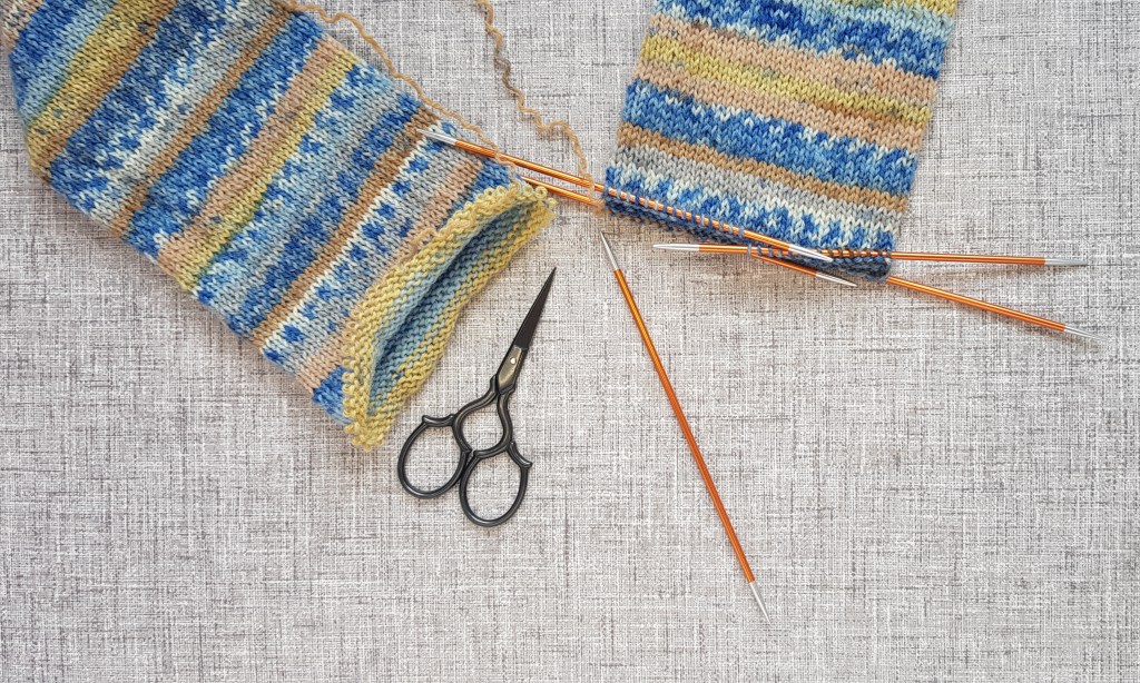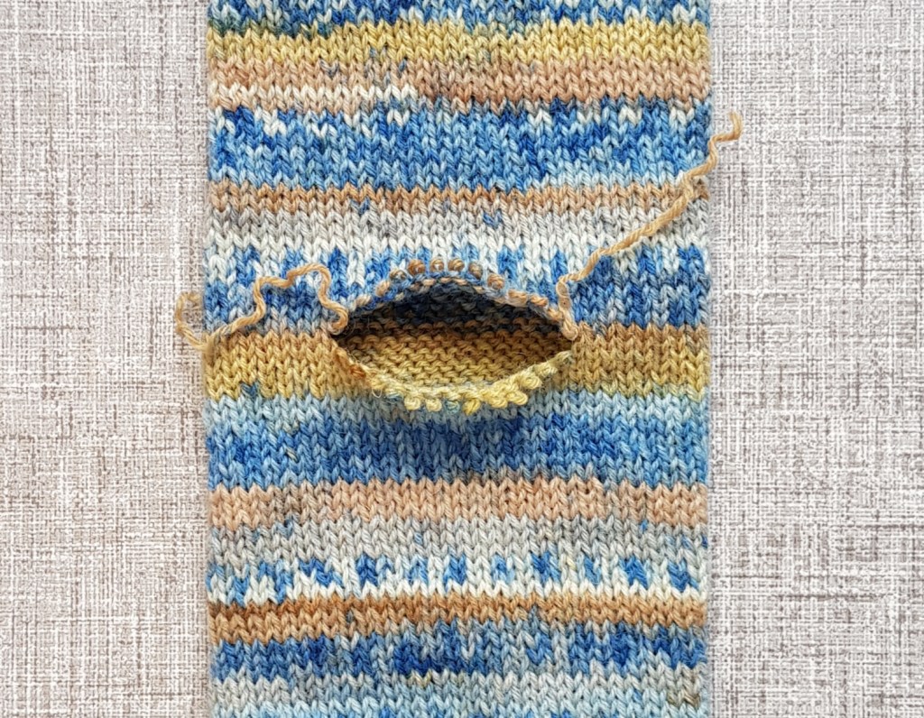 Gently undo the stitches all the way round until you have two halves. These raw stitches are waiting to become sock toes. Pick up the loose stitches with your sock needles (circulars or dpns whatever your preference)